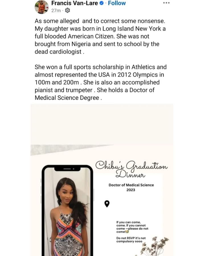 Furthermore, Van-Lare refutes claims that Dr. Erinne brought his daughter from Nigeria and sent her to school abroad, stating that she was born and raised in the United States.