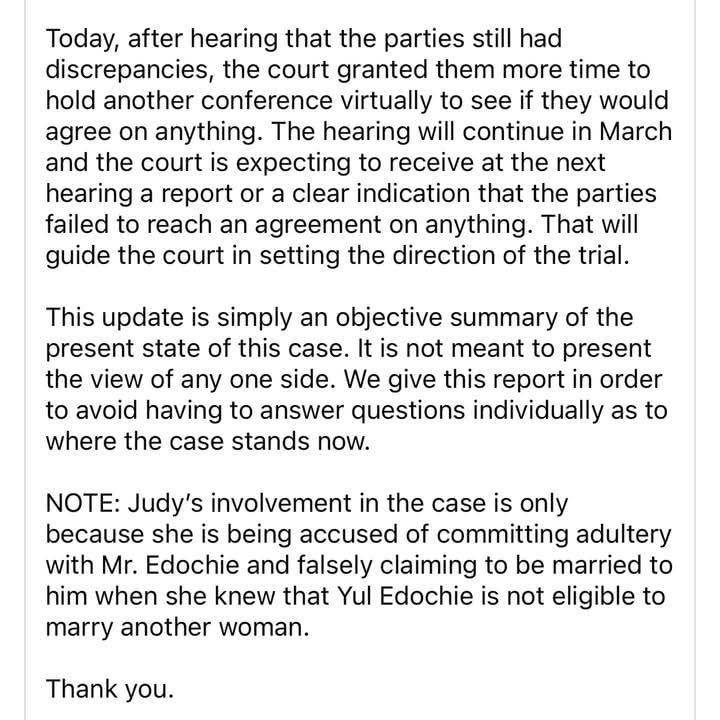 Unfortunately, I cannot provide the specific details of the update as those details would likely be found in recent news reports or legal announcements.To get the most current information, I recommend searching for news articles or legal updates related to May Yul-Edochie’s divorce case.