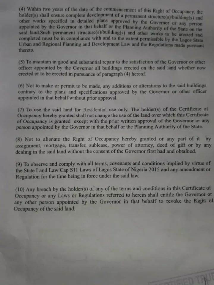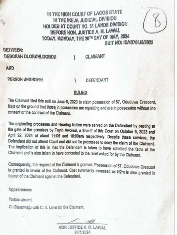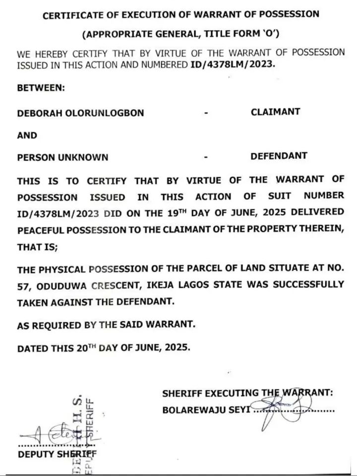 Beyond the court judgment, Mrs. Olorunlogbon possesses Certificates of Occupancy and other official government documents validating her ownership of the property. She is legally entitled to use the property as she sees fit until a court rules otherwise.