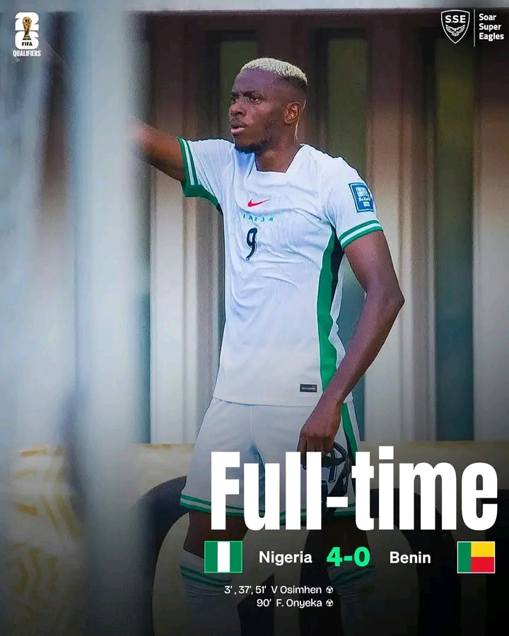 The Super Eagles of Nigeria have booked their place in the World Cup qualification playoffs after a commanding 4–0 victory over Benin Republic in Uyo.The Nigerian side delivered a masterclass performance, thrilling fans with fluid attacking play and solid defending throughout the encounter. Goals from Victor Osimhen, Ademola Lookman, Samuel Chukwueze, and Alex Iwobi sealed the emphatic win, ensuring Nigeria’s progression to the next stage of the qualifiers.